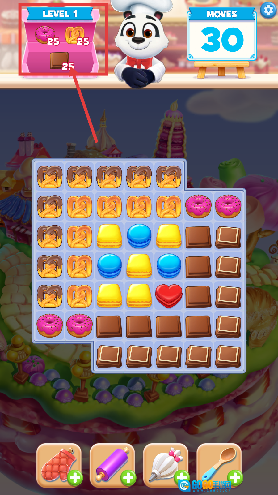 1、在LEVEL-1关卡中,需要收集的目标物品已明确为【甜甜圈-25个】【椒盐卷饼-25个】【巧克力-25个】,玩家可使用30次移动机会,着手进行布局与消除操作。