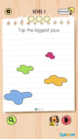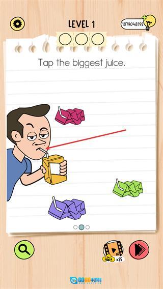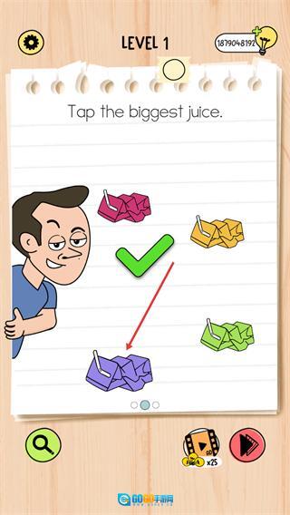 2、在第1关中将果汁给角色喝完后获取包装,观察界面中不同颜色的果汁包装,找到最大的那个,以此完成该步骤的操作。