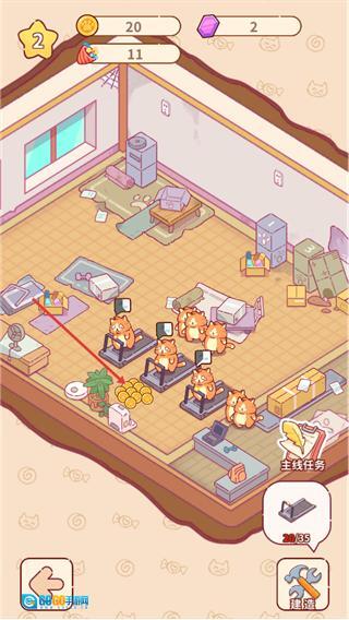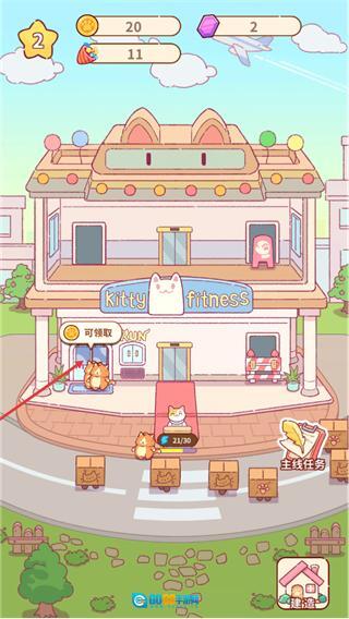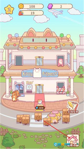 1、进入猫咪健身房建筑界面,点击带有可爱猫标识的小门进入健身房内部,同时可查看主线任务或点击界面的建造按钮进行建筑相关操作。