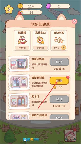 4、打开俱乐部建造界面,可查看储钱罐、离线收益、自动来客等功能,消耗对应资源点击解锁按钮开启储钱罐,该功能可自动积攒金币。