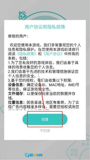 1、首先,仔细阅读《用户协议和隐私政策》,点击“同意”按钮进入游戏。