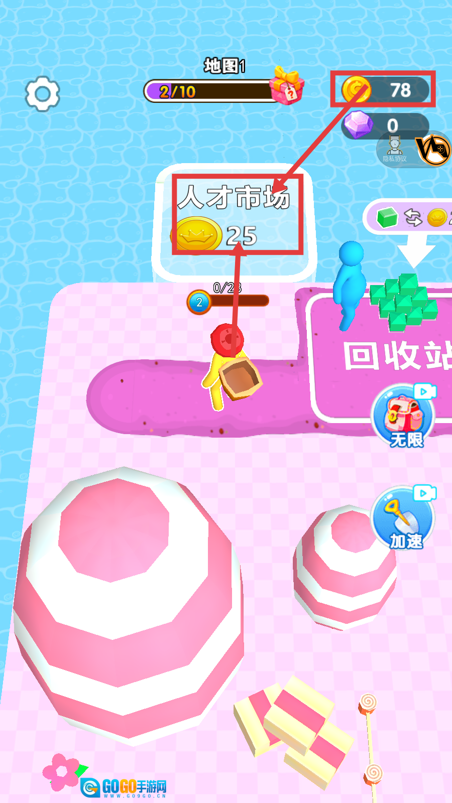 4、前往【人才市场】,花费【25】金币解锁功能,积累金币至【78】,推进游戏进度,解锁新区域。