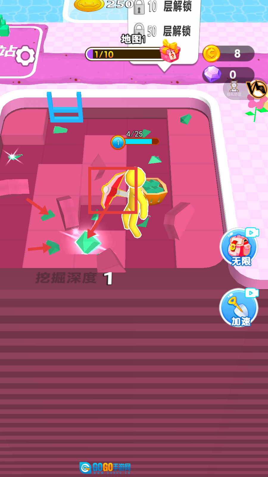 1、在【地图1-第1层】,操控黄色小人拿工具挖掘绿色矿石,积累资源,可查看【博物馆-250】金币目标,熟悉挖矿操作。