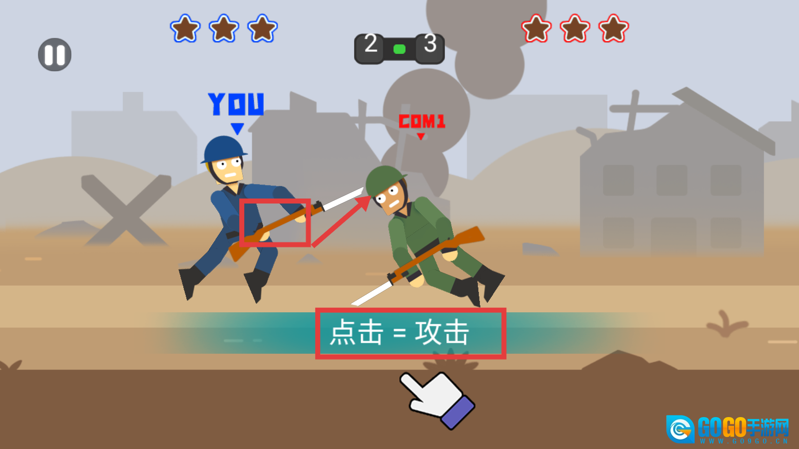 2、战斗时,操控己方士兵,看到【点击=攻击】提示,点击屏幕即可发动攻击,优先攻击敌方【COM1】士兵,积累战斗经验。