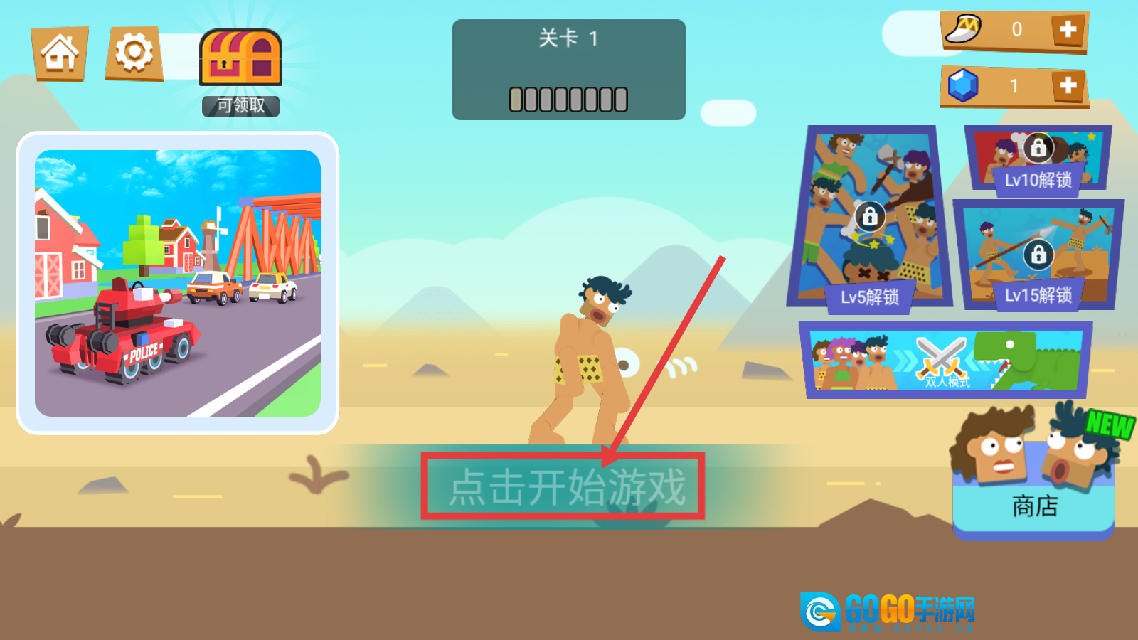 1、进入游戏后,在【关卡1】界面点击【点击开始游戏】按钮,可查看右侧Lv5、Lv10等解锁内容,熟悉界面后开启战斗。