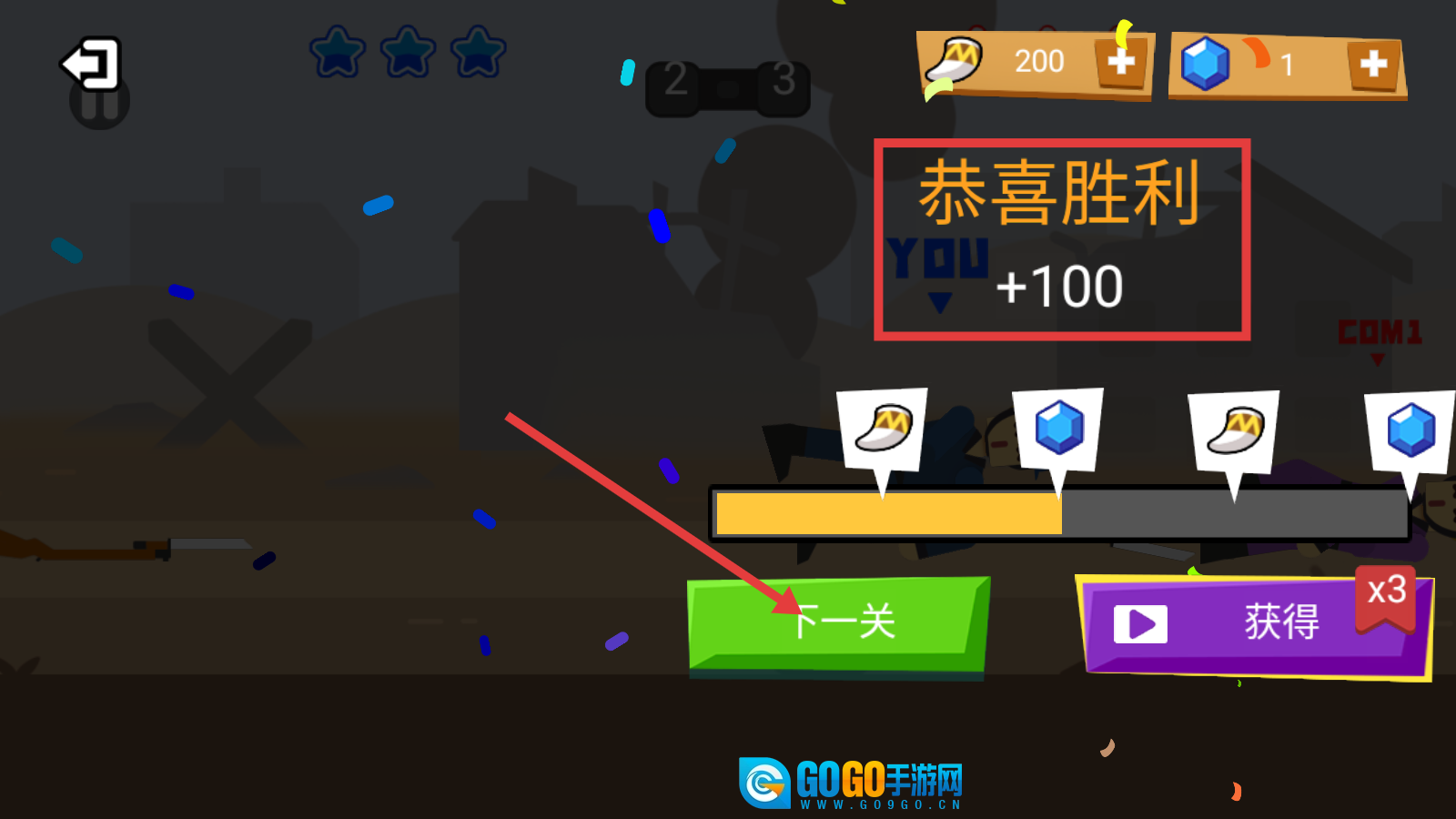 4、通关后出现【恭喜胜利】界面,获得【+100】奖励,点击【下一关】按钮继续挑战,积累资源可用于解锁新角色或升级装备。