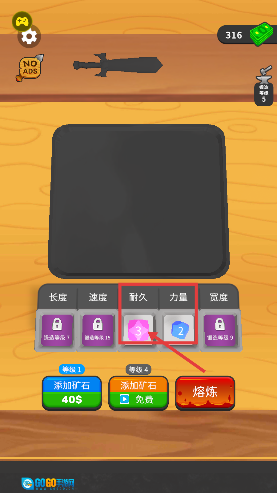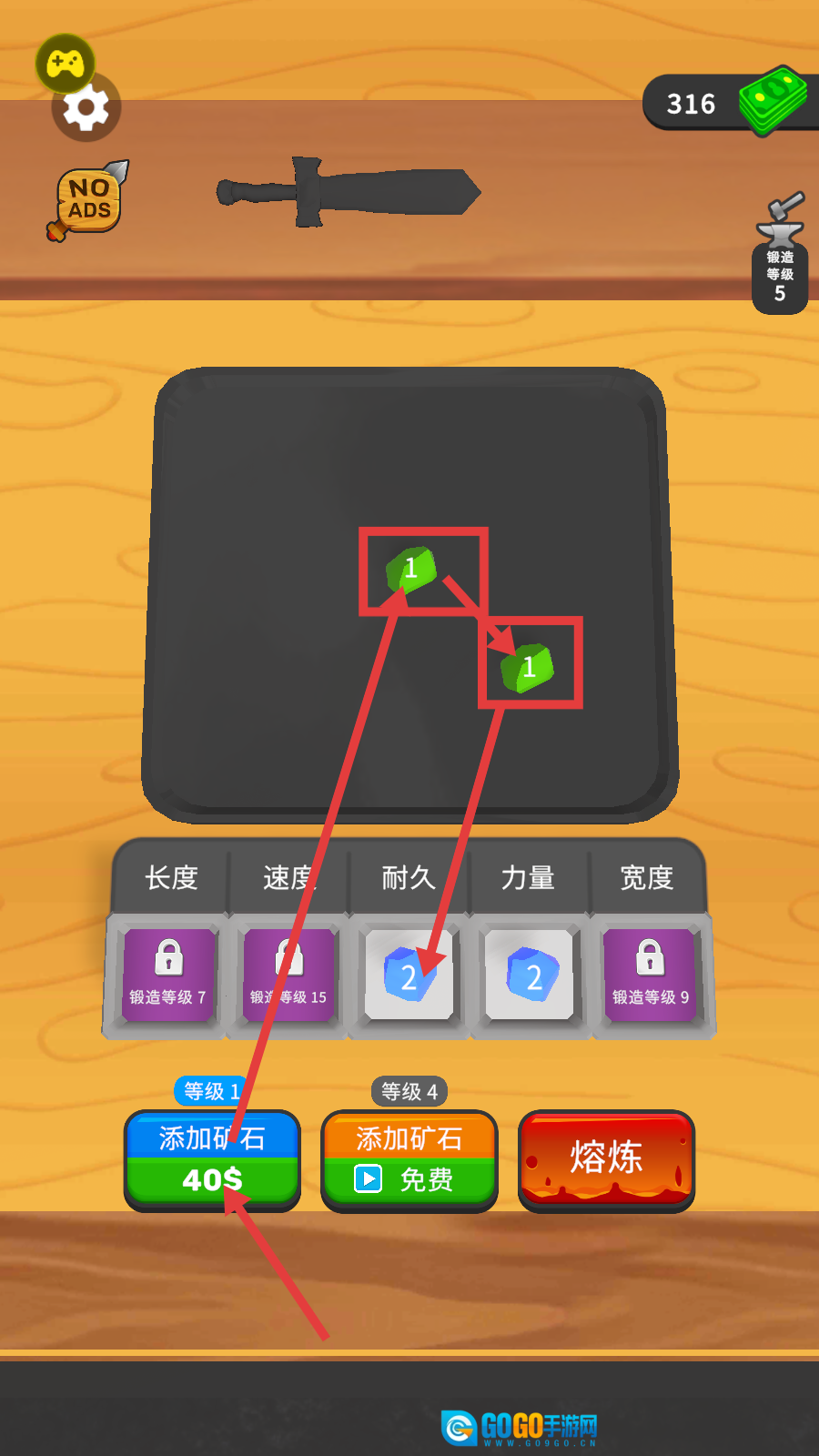 1、点击【添加矿石-40$】,添加绿色矿石,提升【耐久】属性,锻造等级5,为武器强化奠基。