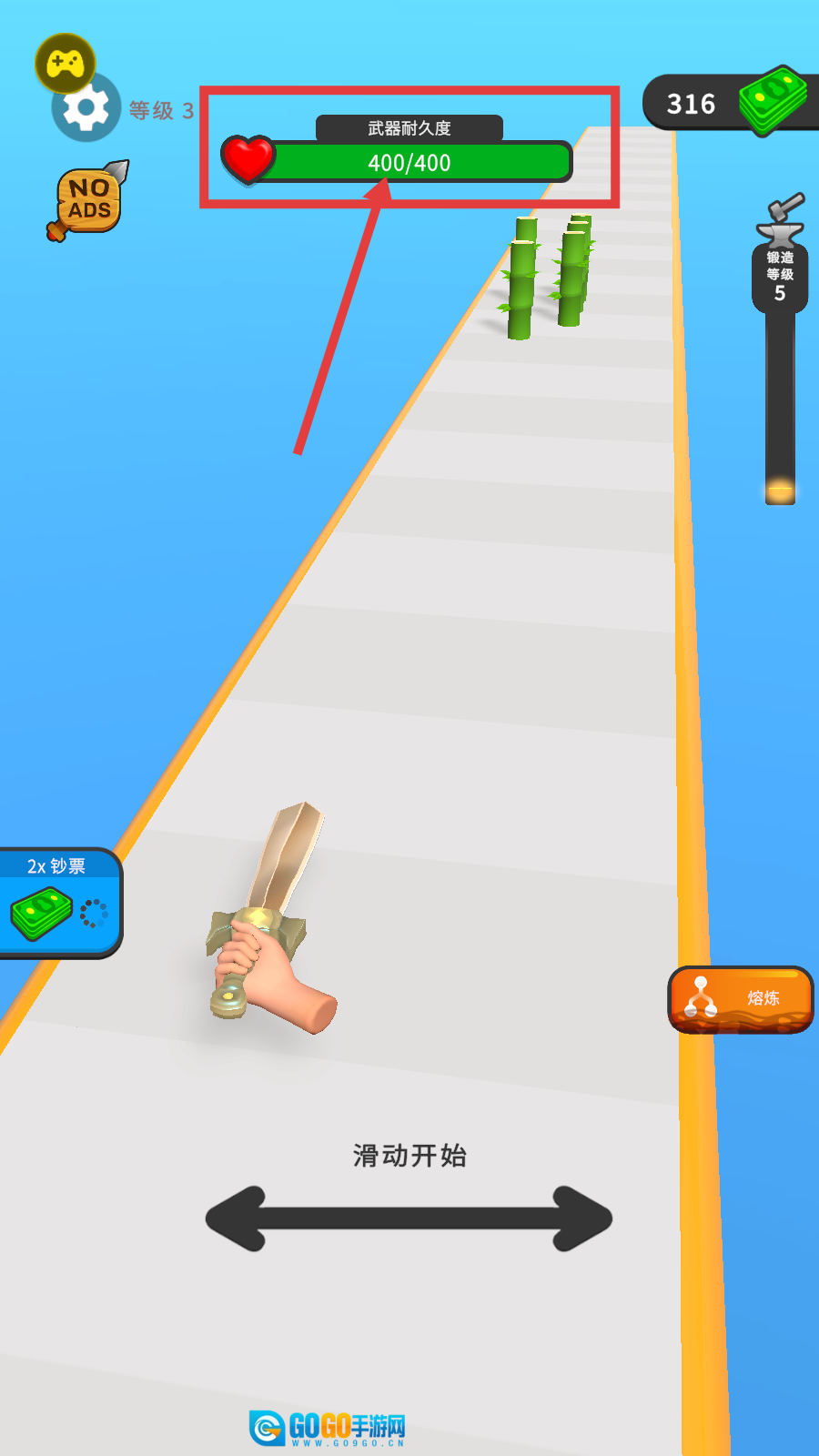 4、武器耐久度达【400/400】,等级3,滑动开始闯关,凭高耐久武器挑战关卡。