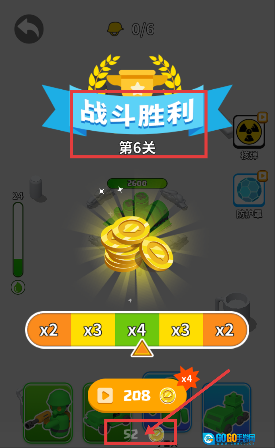 4、获得【战斗胜利-第6关】后,领取【金币-52】奖励,积累资源用于兵种升级或资源获取。