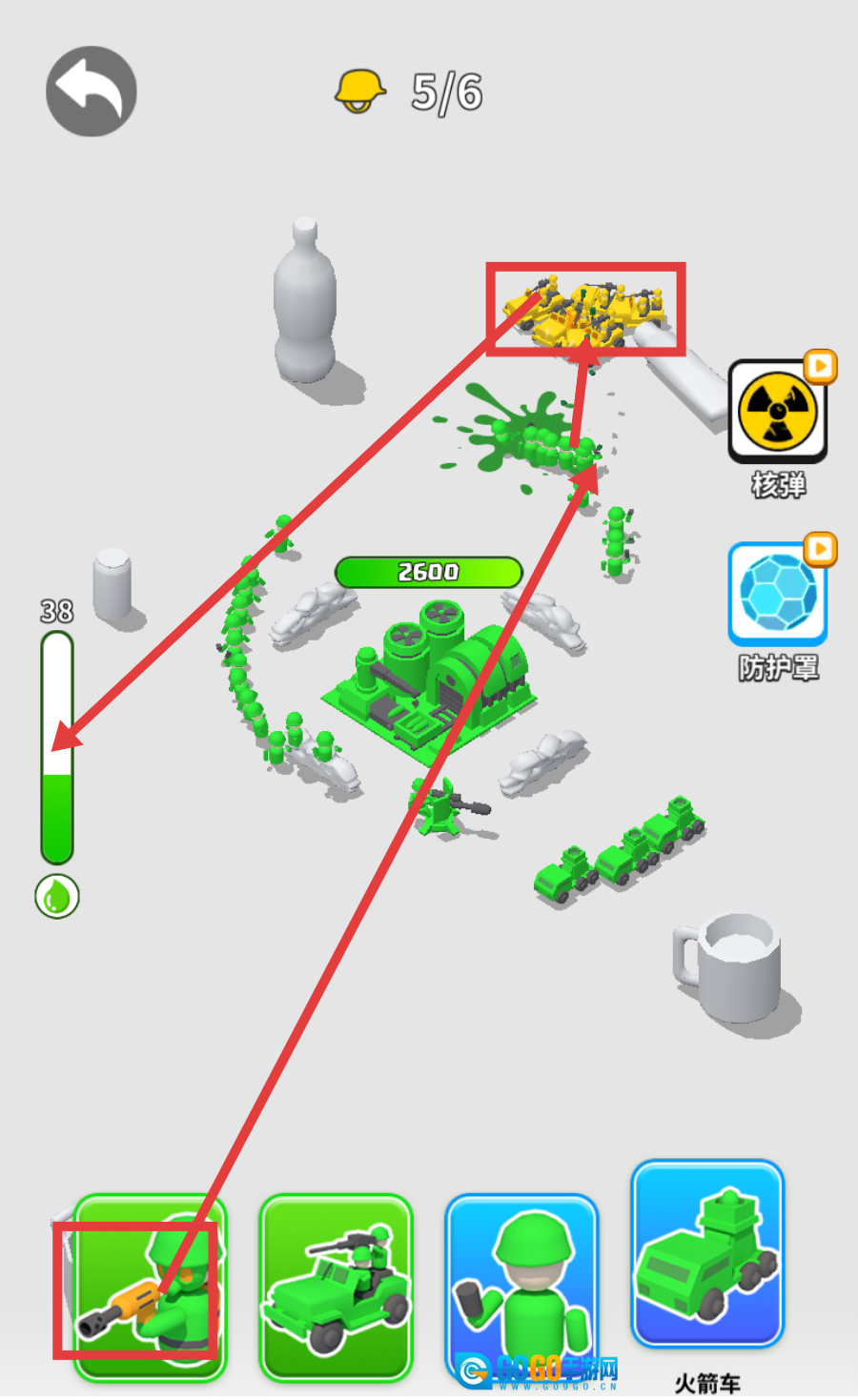 2、战斗中使用【喷火兵】攻击敌方黄色单位,留意左侧资源条,合理调配兵力提升战力。