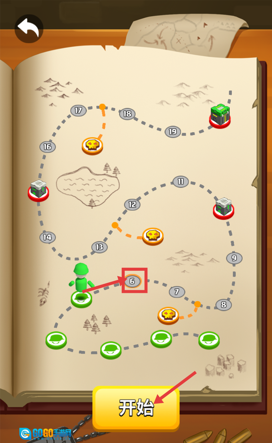 1、在关卡地图选择【6-关】,点击下方【开始】按钮进入战斗,按地图路径推进解锁后续关卡。