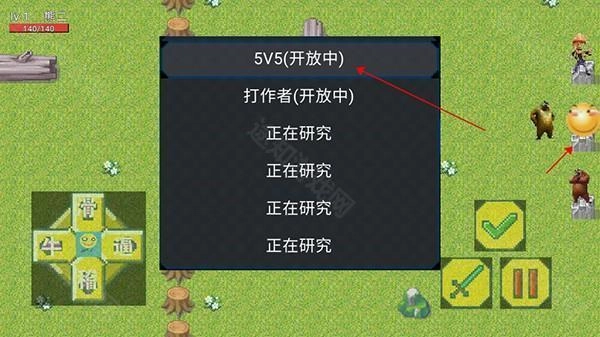 3、找到滑稽图标,点击攻击按键与其对话,然后选择5v5模式;
