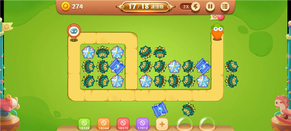 我们需要保护糖果车不被怪物吃掉,收集到的糖果车数量越多,每个糖果车带来的加分就越高。对糖果车威胁最大的要数飞行怪了!它们移动速度很快,能迅速追上糖果车。不过飞行怪的血量相对其他怪物要低一些,所以我们得布置减速炮塔来降低它们的速度,这样其他炮塔就能有更充足的时间攻击,尽快消灭飞行怪。