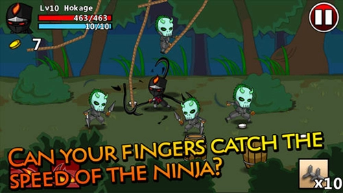 4、游戏的操作方式是点击屏幕,持续点击还能触发连击效果;屏幕左下方有个忍术按钮,玩家可以通过寻回的卷轴解锁并学习更多强力忍术,这些忍术能和普通攻击搭配形成组合攻击,在实战中效果非常好;忍术使用完之后,可以用一只手按住屏幕、另一只手滑动屏幕的方法来补充。