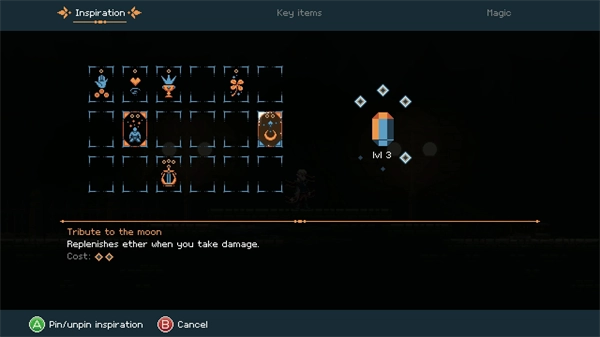 游戏使用了攻击、跳跃、闪避、治疗和魔法的基本动作。游戏中可以解锁四种魔法类型,主要三种在战斗和解谜中都有特定用途,因此每种攻击都显得有目的且无多余(除了击败可选Boss获得的第四种魔法——我一直没弄明白它的用途)。