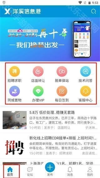 1、在本站完成安装后,进入软件的“首页”界面。在这个页面里,用户能够浏览各类信息,像求职招聘、店铺转让、同城闲置物品交易等内容,所有信息均实时更新,确保用户获取到最新动态。