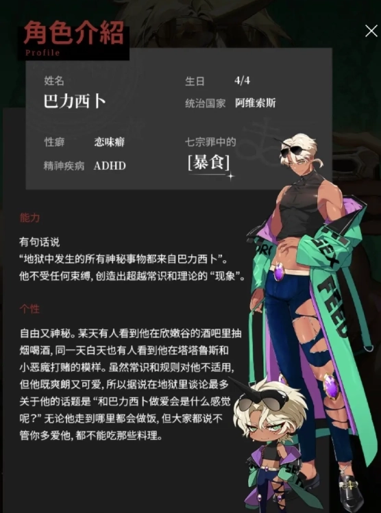 个性:自由又神秘。某天有人看到他在欣嫩谷的酒吧里抽烟喝酒,同一天白天也有人看到他在塔塔鲁斯和小恶魔打赌的模样。虽然常识和规则对他不适用,但他既爽朗又可爱,所以据说在地狱里谈论最多关于他的话题是"和巴力西卜做爱会是什么感觉呢?"无论他走到哪里都会做饭,但大家都说不管你多爱他,都不能吃那些料理。