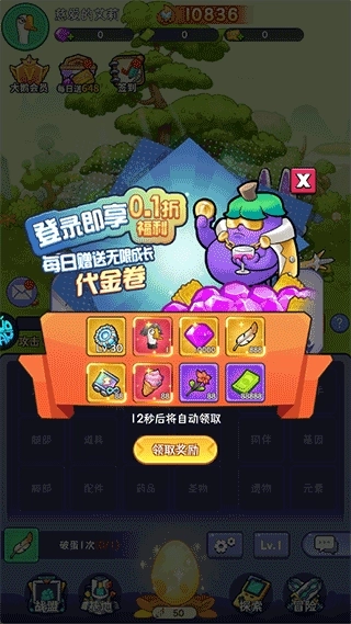 1、登录游戏后会自动获得0.1折扣福利,并且每天都能领取无限成长代金券;