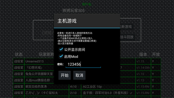 3、要是想自己创建房间,就点击主机新游戏,输入密码后点击开始。