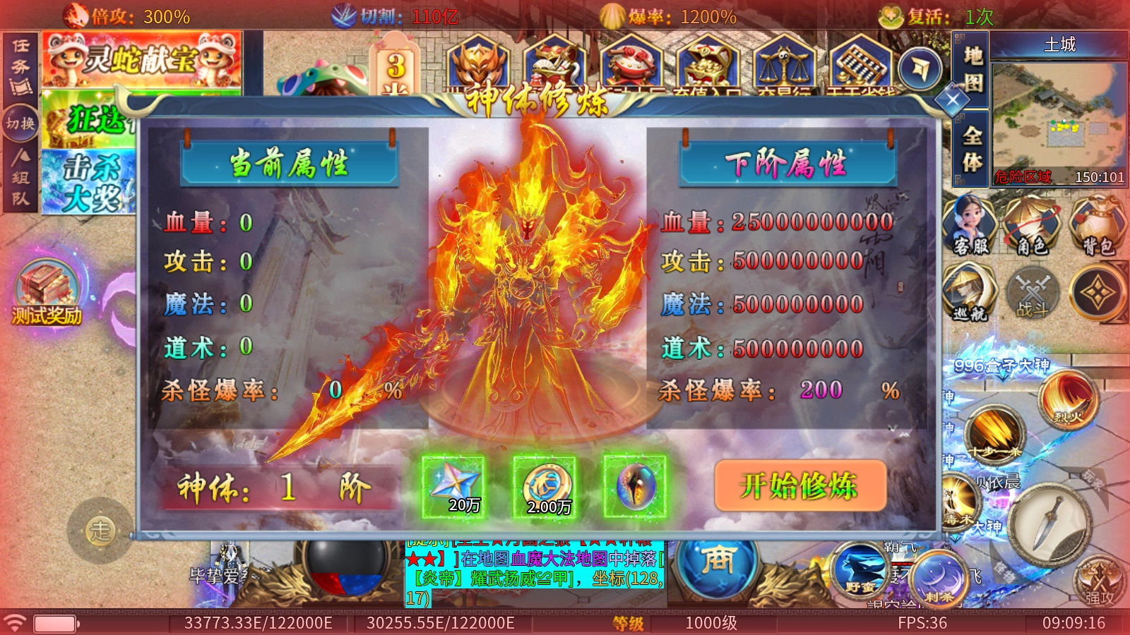 2、神体修炼:消耗追梦币、直购币与妖兽魔核即可完成升阶,不仅能大幅提升属性,还可增加杀怪爆率!