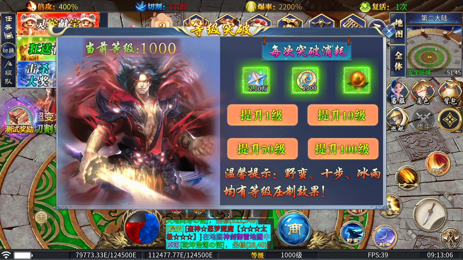 4、等级突破:当人物等级提升至1000级时,便可前往二大陆,通过消耗追梦币、直购币与等级神丹完成突破。