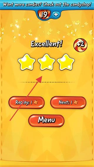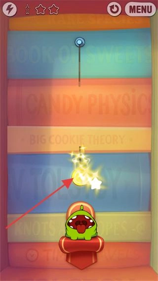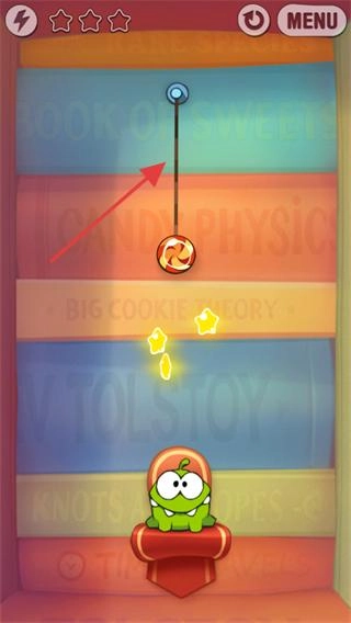 3、要想办法让青蛙吃到糖果,与此同时,还得让糖果触碰到所有星星来完成收集。