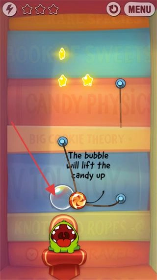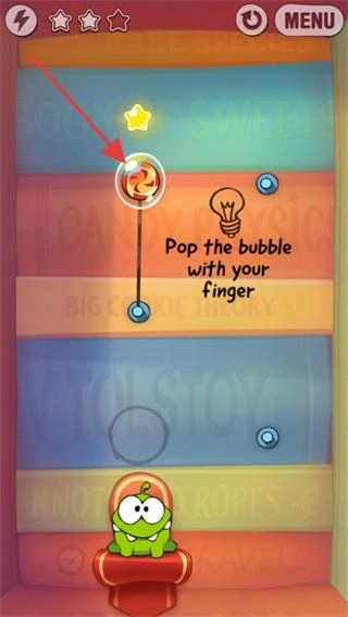 2、点击泡泡就能将其击破,使糖果掉落,让青蛙得以吃到糖果。