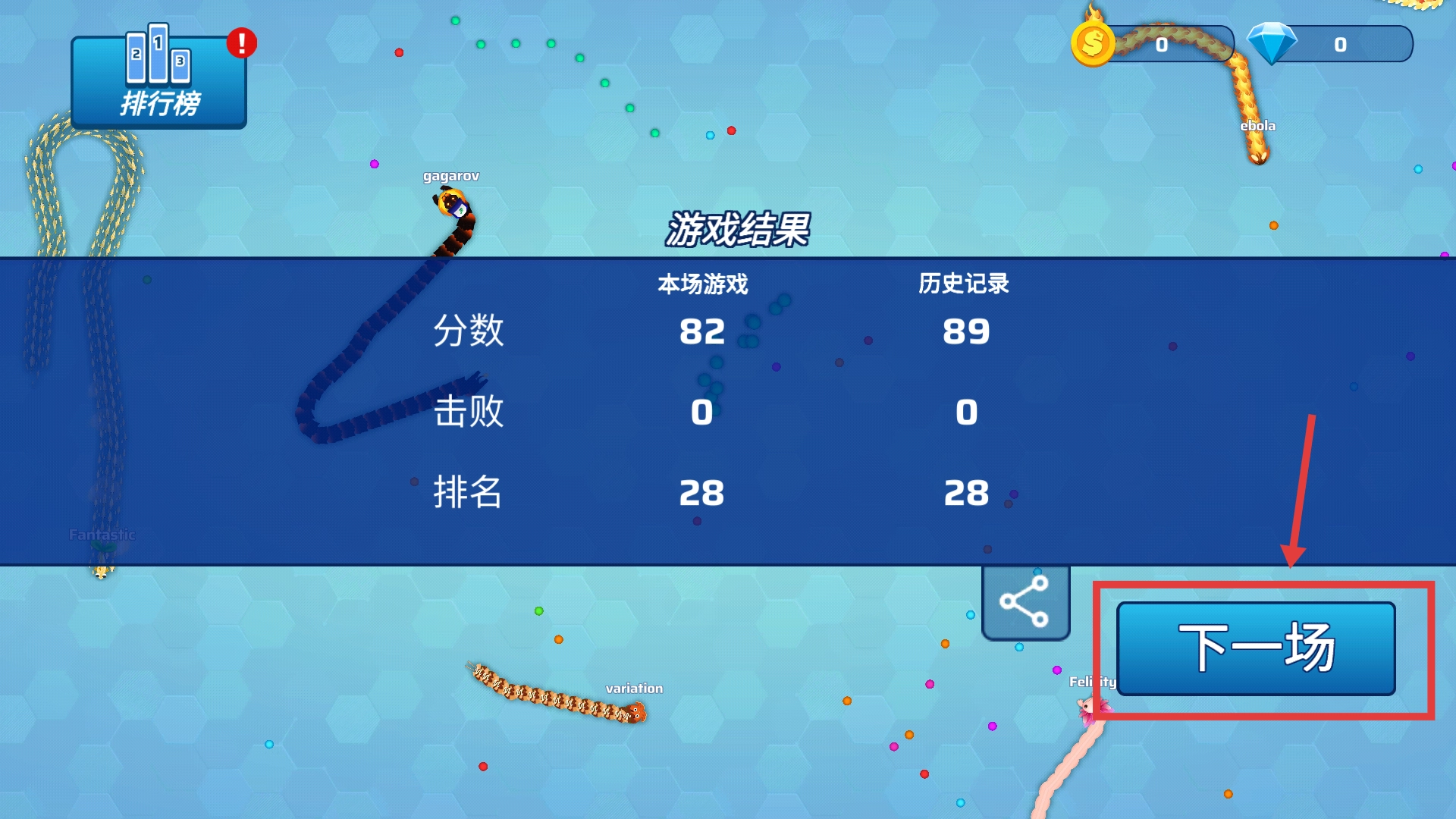 4、结算后查看本场分数与排名,点击【下一场】继续挑战积累生存经验。