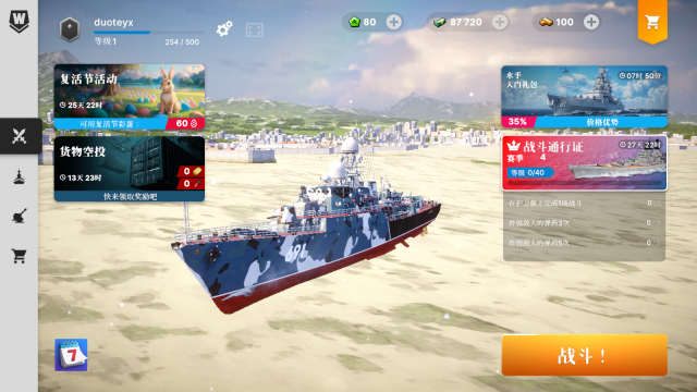 1、进入游戏后,我们可以从几款初始战舰里挑选一艘获取,而且还能搭配不同的皮肤呢。
