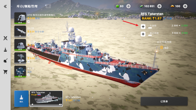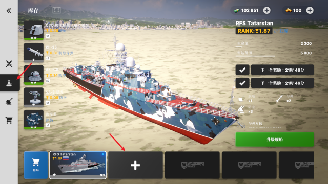 1、点击左侧的战舰图案就能进入对应界面,在该界面中点击“+”号按钮,即可打开战舰购买页面。