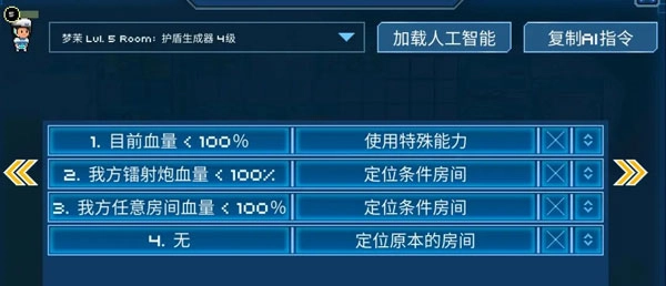 AI的执行逻辑和高考填志愿的规则有点像——当多个触发条件都符合时,只会优先运行排在最前面的那一条指令,后面的不管怎么设置都不会起作用。举个例子,如果给某个角色设定了“无条件坚守我方护盾室”的指令,那他就算战斗到最后一刻也会待在那里,哪怕自身血量低于50%、舰船血量也低于50%,也绝不会离开护盾室去其他位置,因为最优先级的指令已经锁定了他的行动。