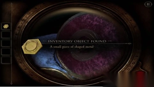 8.戴上我们刚找到的完整眼镜,对着这个圆盒的盖子观察,会发现上面有一个红色指纹,我们需要点击这个指纹的位置。将手按在红色指纹上,此时中间的小圆块就会打开,我们就能获得一个六边形铜片。