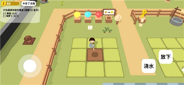 点击屏幕上的水桶,把人物移动到种植的土地旁,此时会出现浇水按钮,点击它就能给刚播下的种子浇水,之后只需耐心等待作物生长即可。