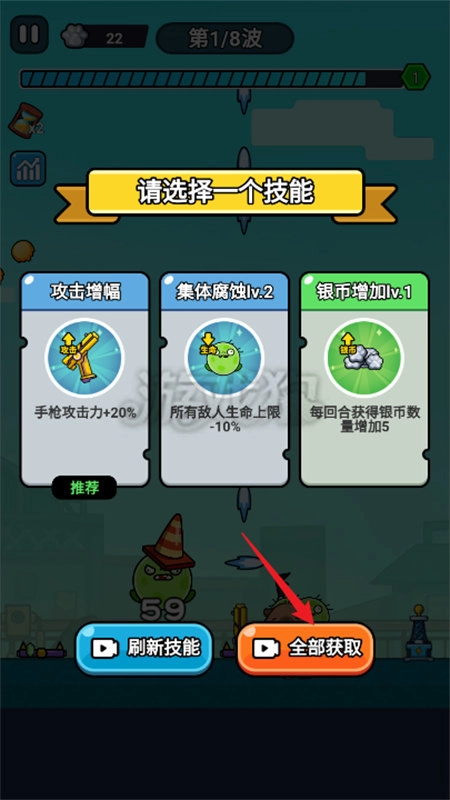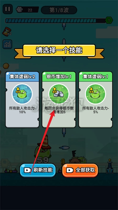 在第二个选择项弹出后,再往左侧移动并进行射击操作。游戏初期阶段,攻击速度的属性格外关键,通过简单的方式就能获取10点的攻击速度加成。