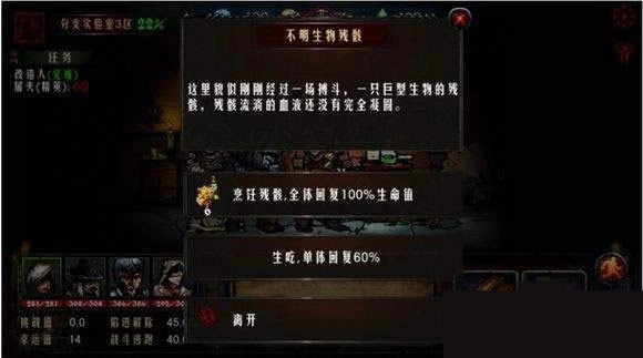 在地牢探索时遇到特定动物遗骸,若当前生命值有损耗,优先选择恢复自身六成生命的选项性价比更高;若后期物资储备充足(尤其是食物存量较多),可消耗六份食物让全队生命值完全回满;要是此刻状态完好没有掉血,建议暂时离开,待后续需要补充状态时再返回处理。