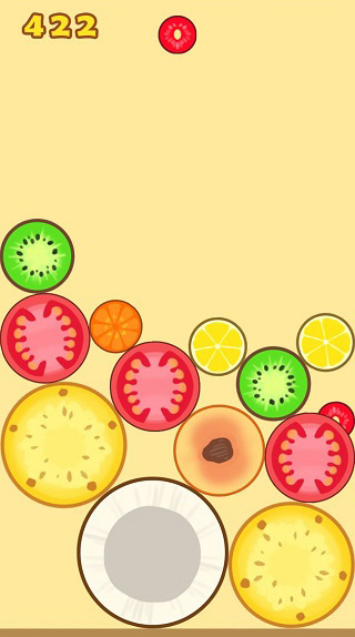 2、一开始玩建议大家有序的排列水果,遵从一个角落水果最大,越往外水果越小的感觉(类似2048),这样容易产生连续合成而节约空间。而且一旦大水果在中间很容易堆太高导致游戏失败。