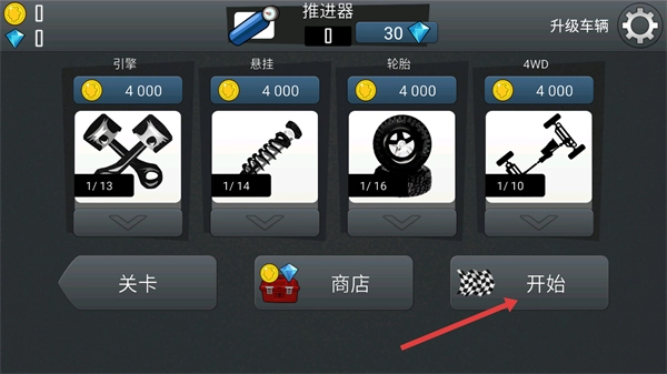 1、在车辆升级界面,你可以消耗金币对【引擎】【悬挂】等部件进行升级,之后点击【开始】按钮就能进入关卡。