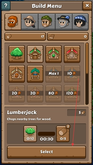 3、在建造菜单里找到Lumberjack伐木工选项,点击Select按钮来确认建造操作。