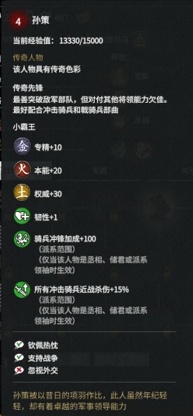 +15%全骑兵近战伤害(势力范围生效,需担任君主、储君或丞相职位)
