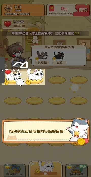 游戏的核心玩法是把两只等级相同的猫咪拖到一块儿,合成一只等级更高的全新品种猫咪。