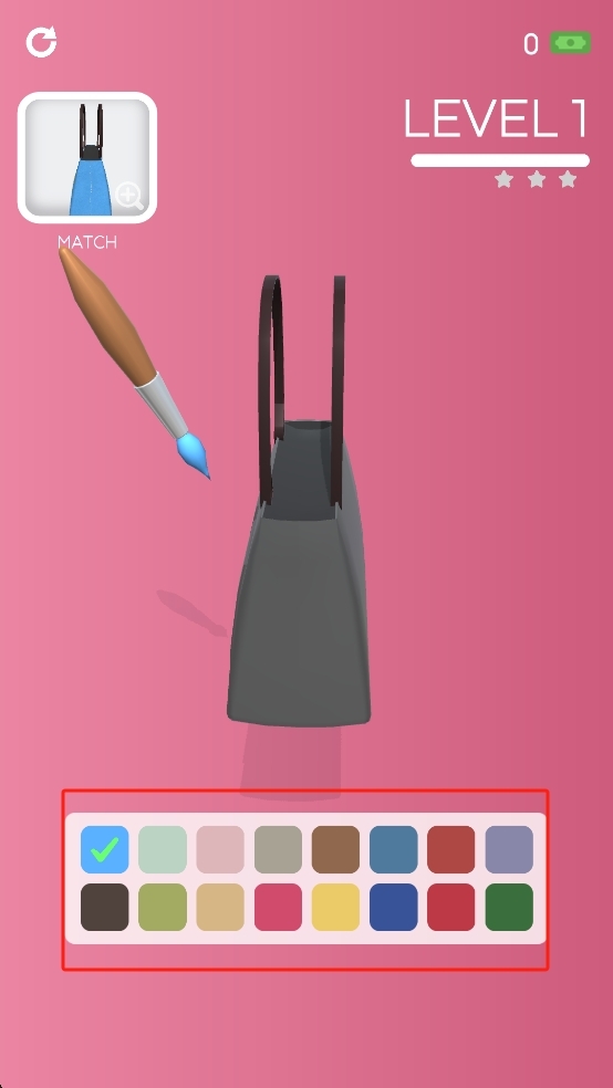 1、按照左上角预览图的提示,我们选取调色盘左侧带有对勾标记的蓝色颜料,利用画笔工具为灰色包包上色,正式启动定制流程。
