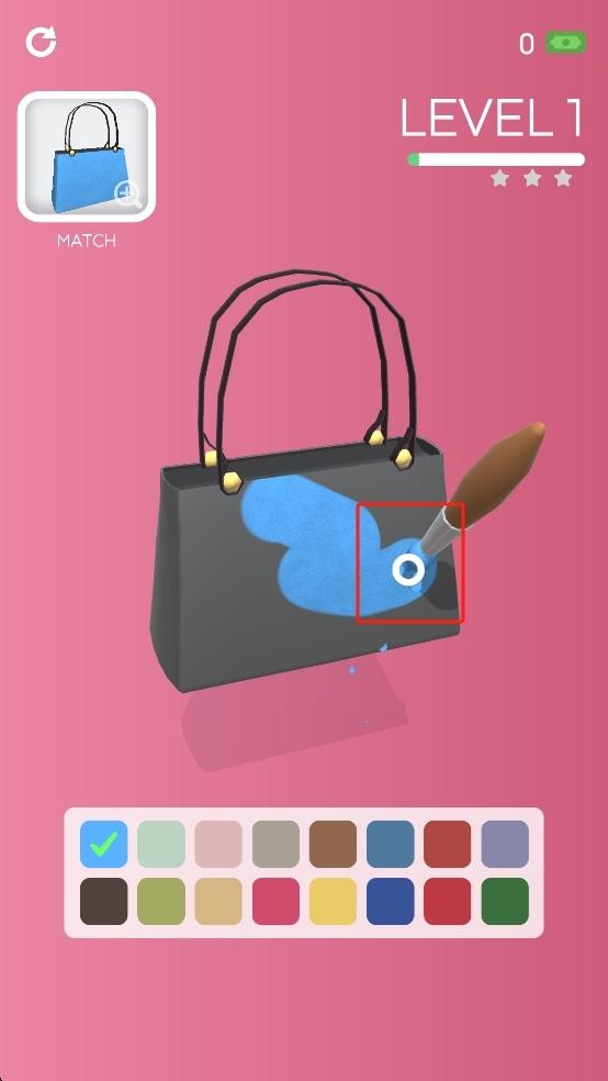 2、用画笔在红框区域持续涂抹,让蓝色颜料均匀覆盖包包表面,同时参照左上角的模板,逐步填充直至色彩完整,以此完成染色步骤。