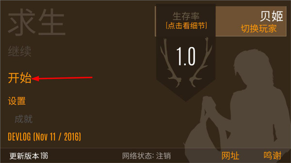 在游戏菜单界面,玩家能够对游戏音乐、开关状态、模糊效果等进行设置,还可以查看生存率,之后点击开始按钮即可进入游戏。