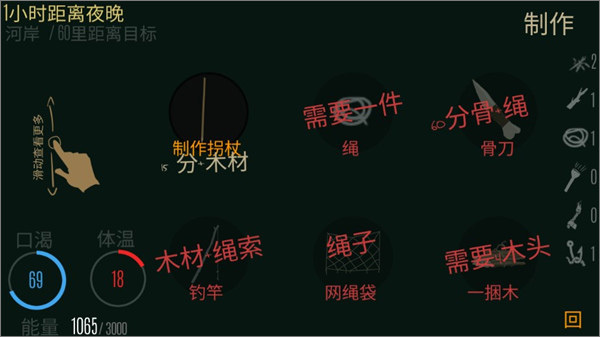 白天可以拆解木桨、木矛、求生手册、绳索手链和能量棒;到了晚上,先生火(记得要添木头,烧两个小时左右就行),然后烧水喝,接着就睡觉到天亮。第二天白天等体温自动恢复到满值后,就能自由选择去砍树、叉鱼或者四处探索了。