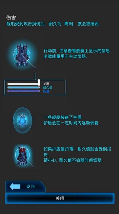 舰船受到攻击损伤后,耐久为'零'时,就会被摧毁,行动前,注意查看舰艇上显示的信息,多数能量用于主动武器。一些舰艇装备了护盾,护盾会在一定时间内逐渐恢复。如果护盾值归'零',耐久值就会受到损伤,请小心,耐久值不会随时间恢复。