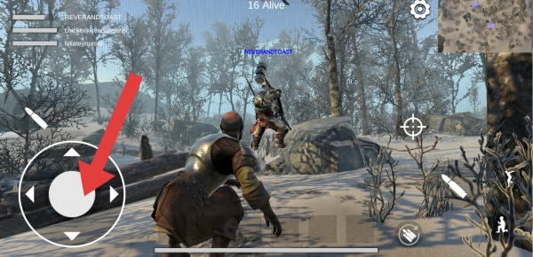 进入游戏的雪地场景后,通过左侧摇杆操控角色移动;一旦发现敌人,就靠近对方并点击攻击按键,以此开启近战交锋。