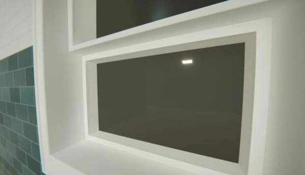 在第六章穿过大型桑拿房后,观察楼梯间内的窗户。