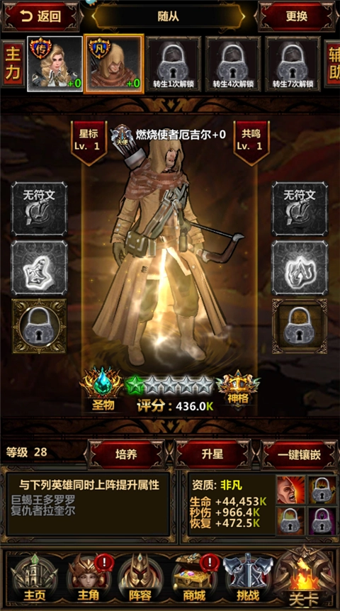 点击阵容即可上阵随从,随从可搭配符文,可升级。