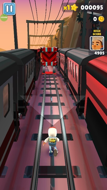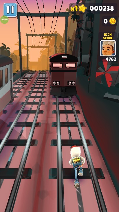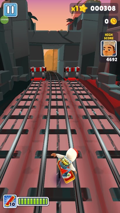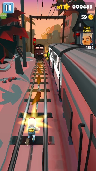 双击屏幕即可启动滑板,滑板效果会持续一段时间。当角色没有滑板时,若撞到火车或其他障碍就会被抓住,游戏随之结束;而处于滑板状态时,角色相当于多了一层保障——即便撞到火车等物体,也只是滑板消失,游戏仍能继续进行。