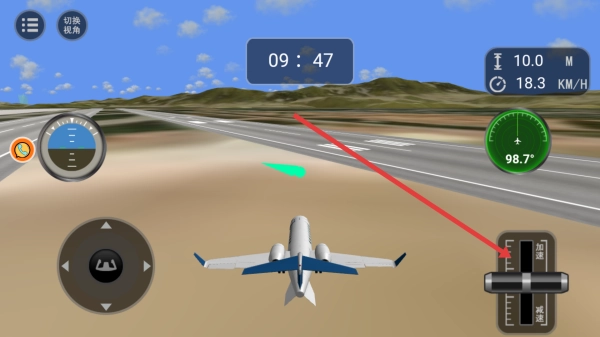 游戏开始时,先让飞机进行滑行操作,通过左下角的方向摇杆来控制飞机的转向,按照跑道上绿色的指引标记调整飞行方向,确保飞机保持直线滑行状态。